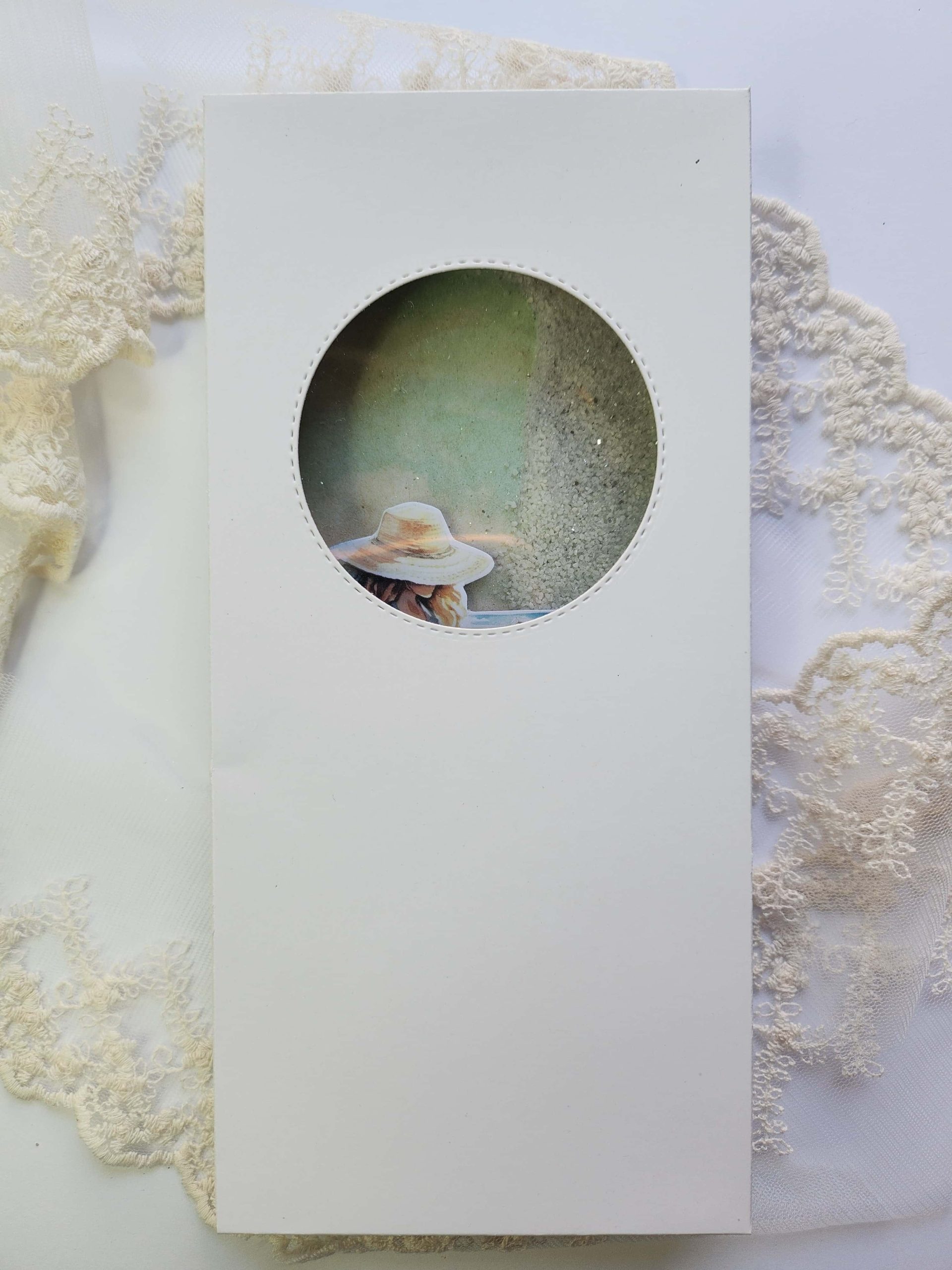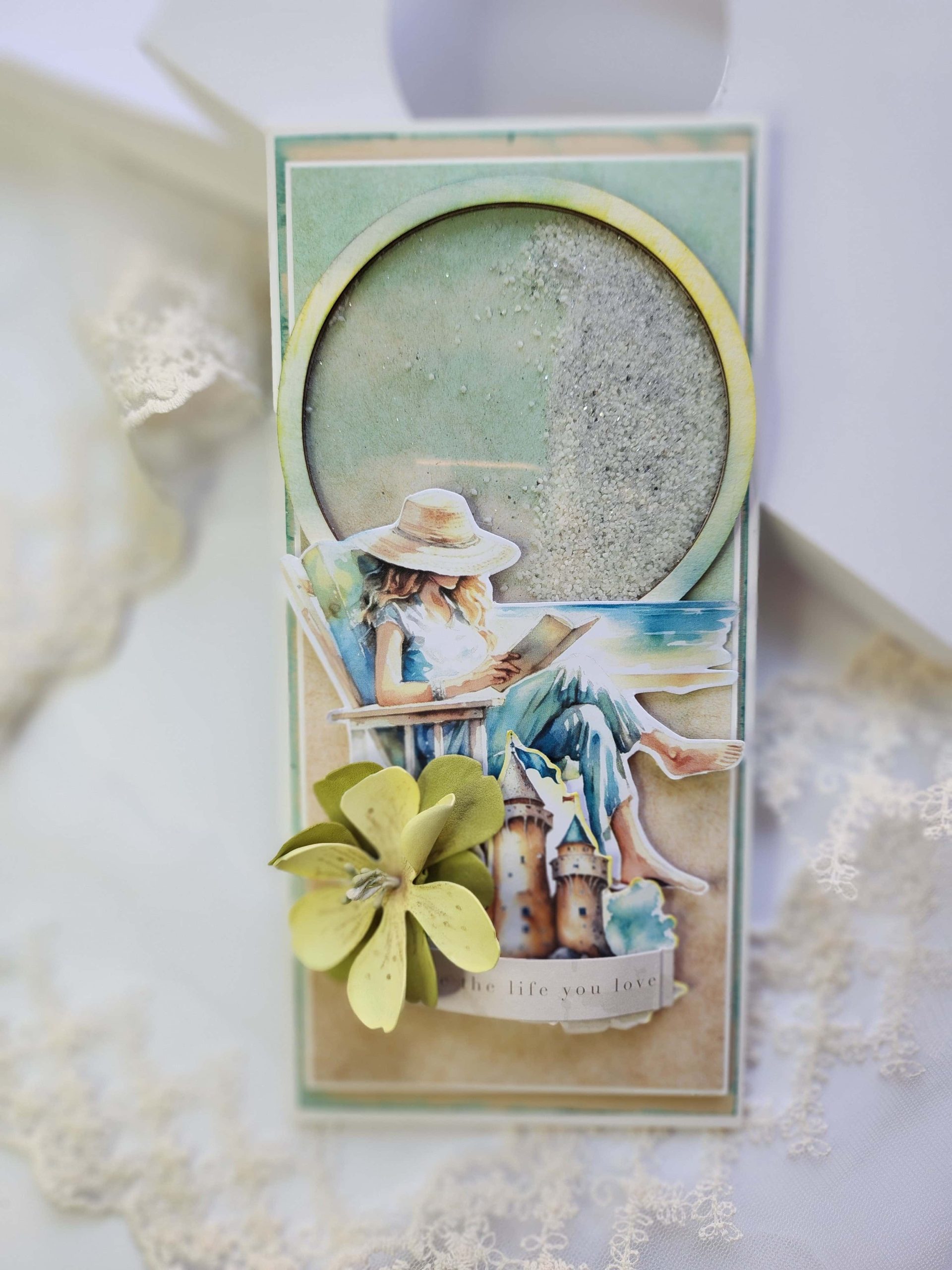 Warstwowa kartka zawierająca zakładkę, za którą zmieszczą się pieniądze, bony podarunkowe, zdjęcia lub dodatkowe życzenia. Okładkę zdobi shaker, czyli okienko wypełnione drobnymi kamyczkami z brokatem, które przesuwają się podczas potrząsania.