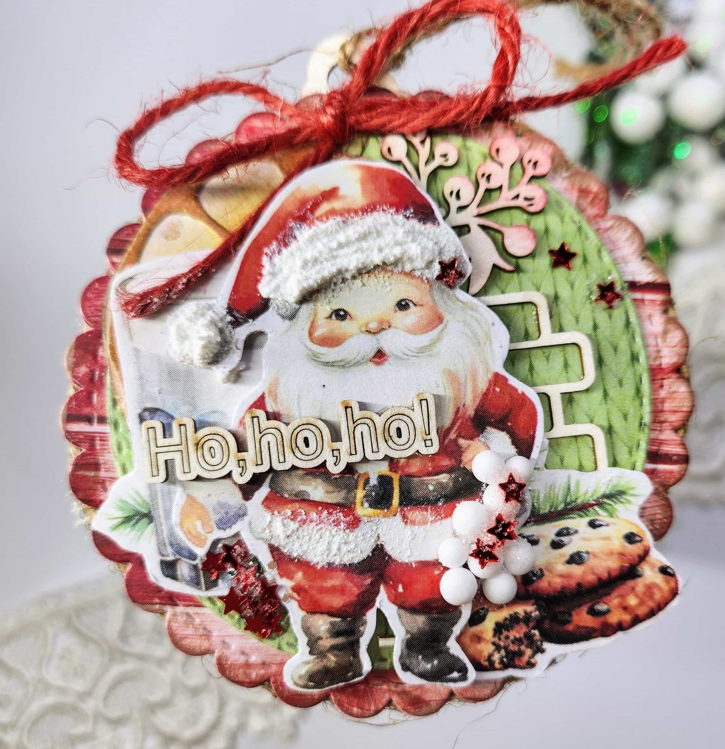 Ozdoba choinkowa wykonana na bazie beermaty (tektury) oraz papieru świetnie nadaje się do dekoracji choinki. Jest lekka i w przeciwieństwie do tradycyjnych bombek nie tłucze się. Można nią ozdobić choinkę, stroik lub powiesić na ścianie.
